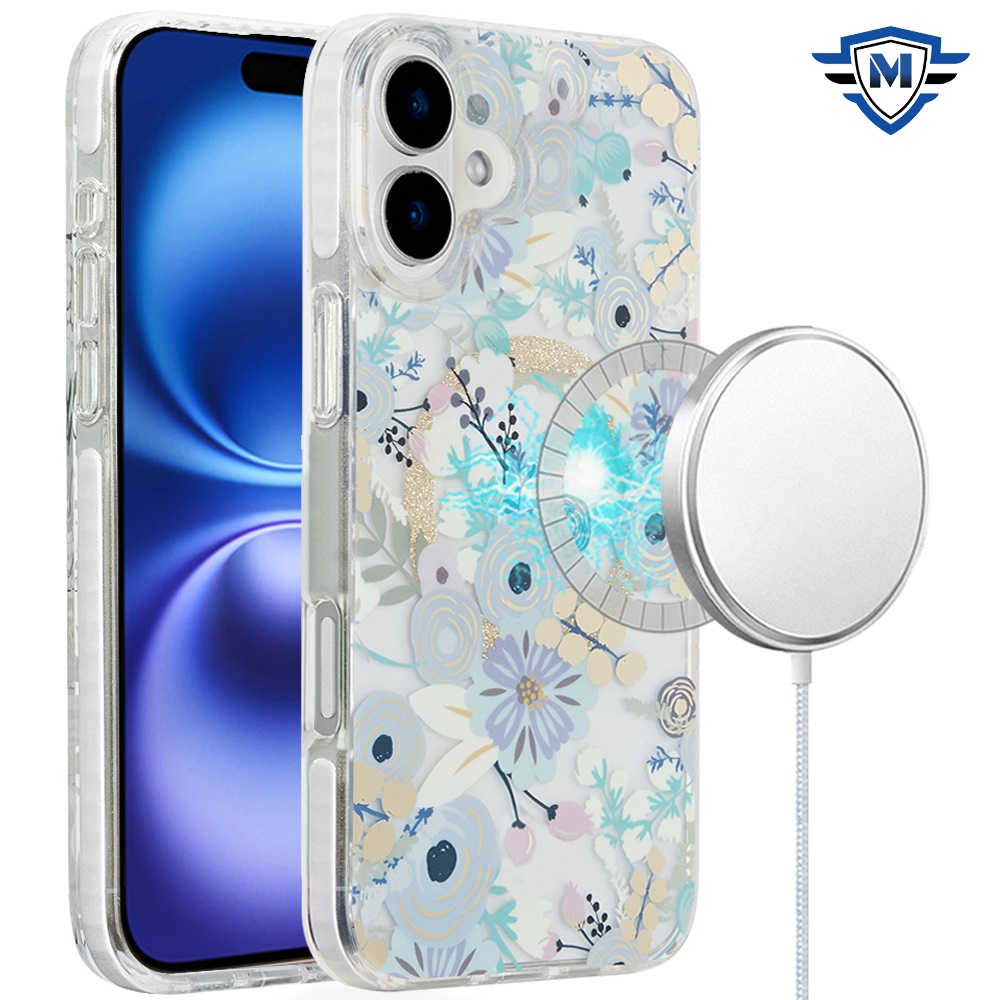 [METKASE] For iPhone 16 6.1 inch Magnetic Double Layer IMD Design Case - Blue Floral