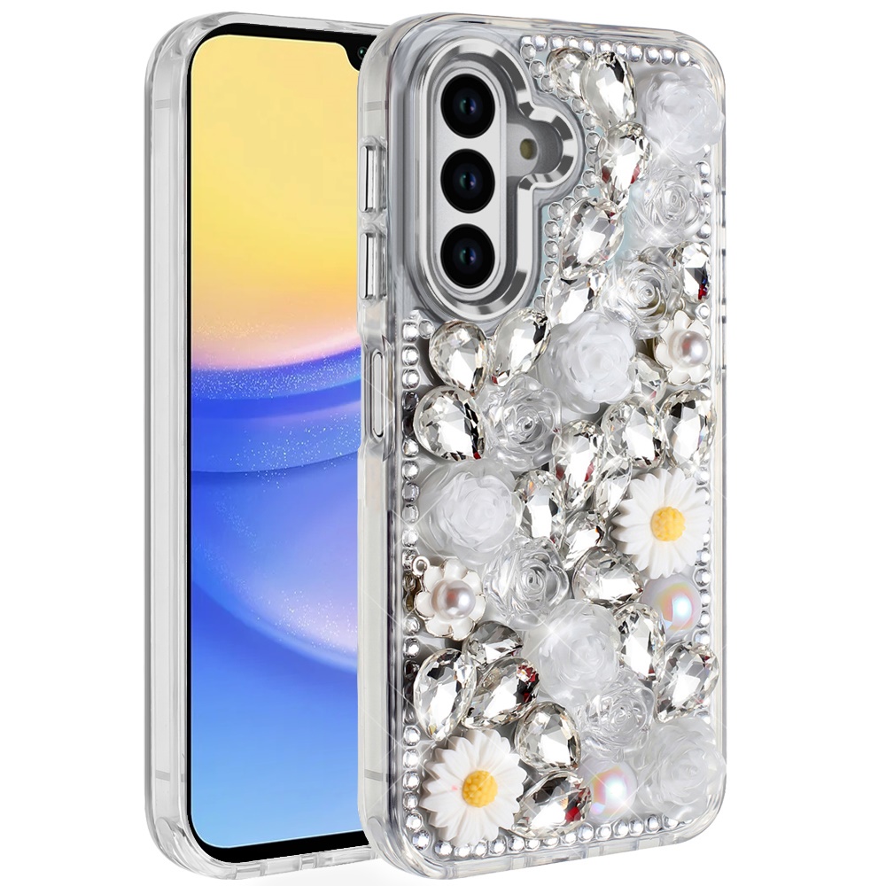 For Samsung A15 5G Spectacular Full Bling Stones Glitter HQ Hybrid Floral Series - White