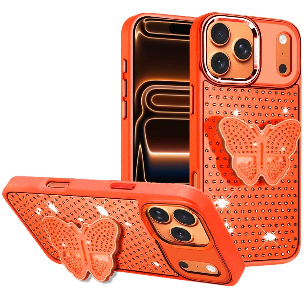 For iPhone 17 Pro Butterfly Moveable Grip Stand With Small Diamonds Meta Buttons HQ Hybrid - Cosmic Orange