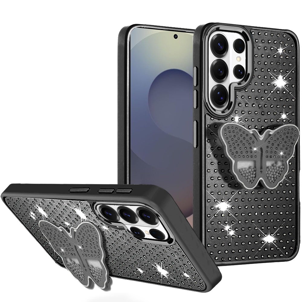 For Samsung s26 Ultra Butterfly Moveable Grip Stand With Small Diamonds Meta Buttons HQ Hybrid - Black