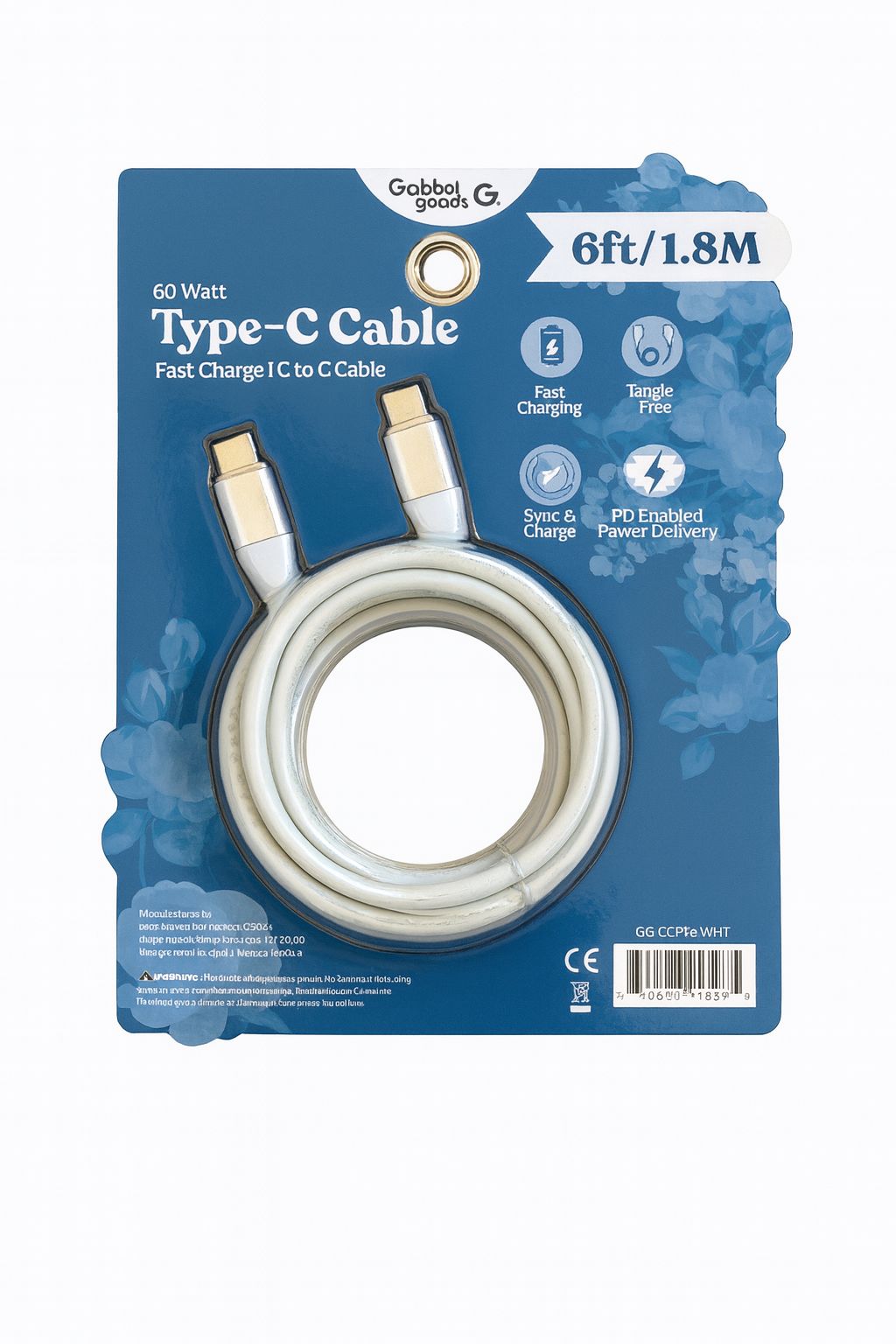 GG 60 WATT 6FT TYPE-C FAST CHARGE C TO C CABLE - TANGLE FREE - SYNC&CHARGE - PD ENABLED POWER DELIVERY - GG-CCPT6-WHT - WHITE (D13 GG#M)