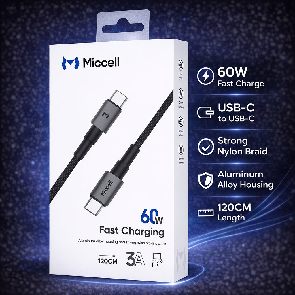 Miccell 4FT 60W 12.M USB-C to USB-C Fast Charging Braided Cable - Black (D19 MICCELL-7)